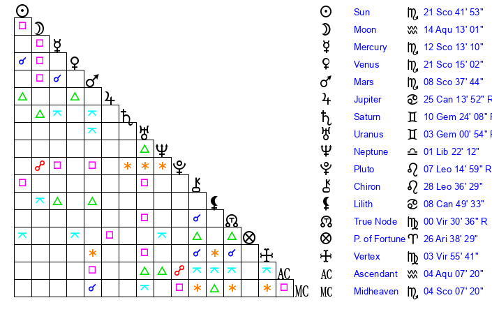 | Sun | 21 Scorpio 42 | 22 Scorpio 34 | 16 Aquarius 2 |