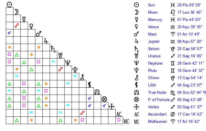 | Moon | 17 Leo 39 | 10 Sagittarius 10 | 9 Aquarius 32 |