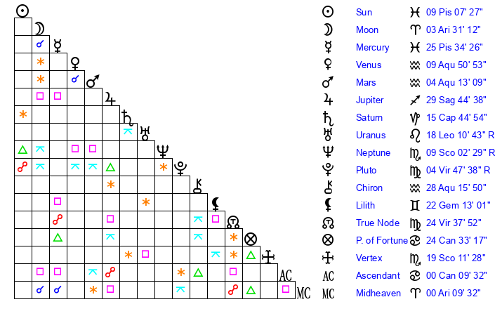 | Moon | 3 Aries 28 | 19 Pisces 32 | 9 Leo 24 |