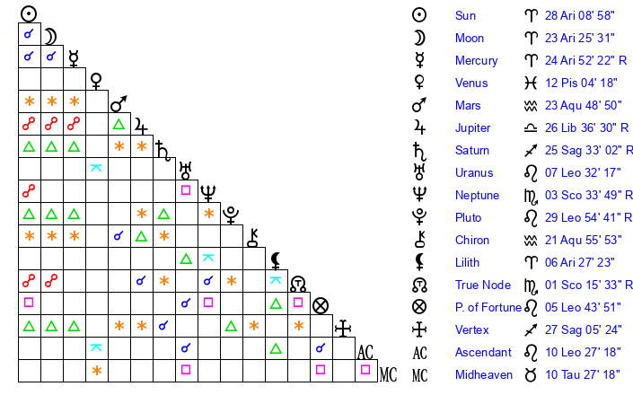 | Venus | 12 Pisces 4 | 25 Pisces 15 | 27 Taurus 21 |