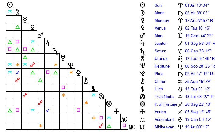 | Sun | 1 Aries 19 | 2 Aries 19 | 5 Gemini 39 |