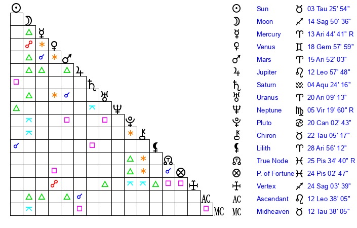 Sun | 3 Taurus 26 | 3 Taurus 55 | 2 Leo 37 |
