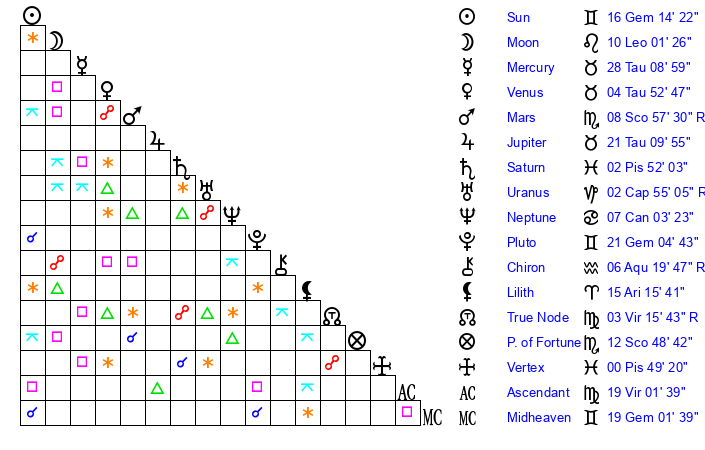 | Sun | 16 Gemini 14 | 17 Gemini 12 | 11 Libra 47 |