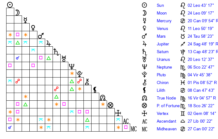 | Moon | 24 Leo 17 | 14 Leo 26 | 14 Capricorn 12 |
