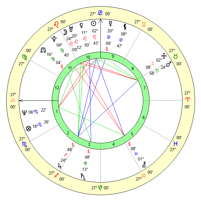 | Venus | 11 Leo 51 | 23 Gemini 43 | 1 Scorpio 50 |
