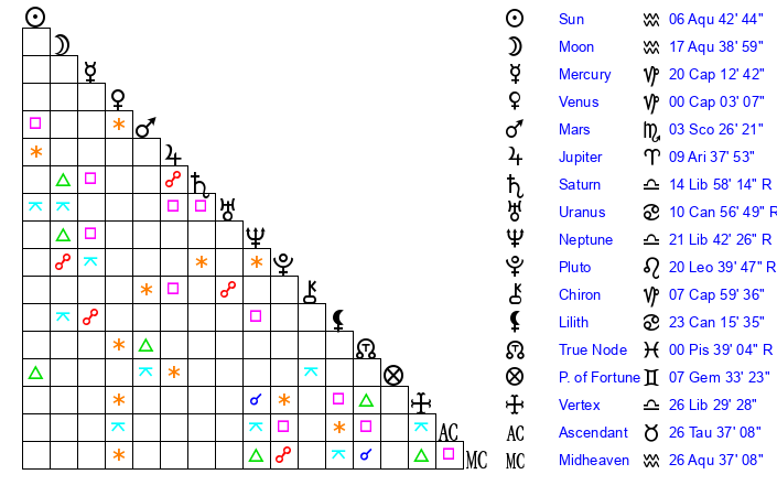 | Neptune | 21 Libra 42 | 27 Pisces 50 | 20 Libra 21 |