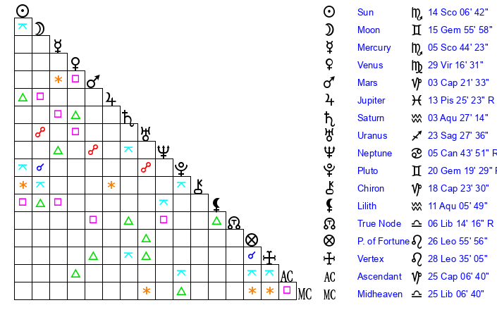 | Moon | 15 Gemini 48 | 16 Gemini 2 | 13 Sagittarius 49 |
