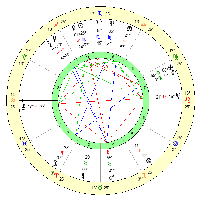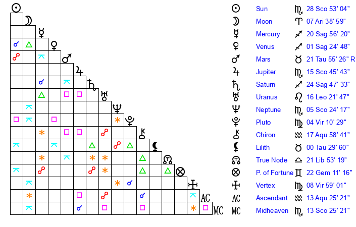 | Moon | 7 Aries 43 | 15 Sagittarius 11 | 13 Virgo 38 |