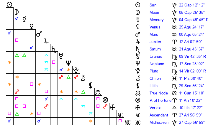 | Pluto | 14 Virgo 2 | 1 Aquarius 27 | 12 Virgo 39 |