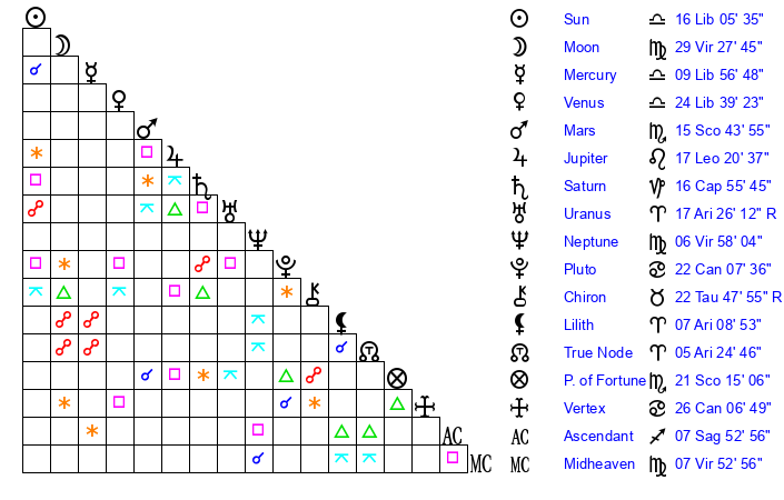 | Sun | 16 Libra 5 | 17 Libra 19 | 20 Capricorn 57 |