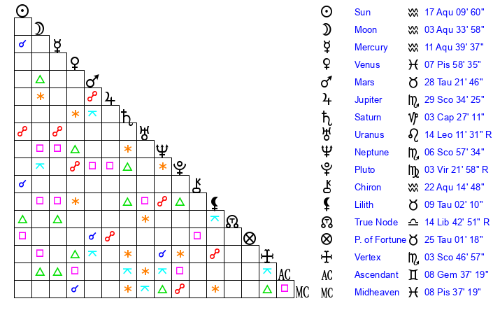 | Moon | 3 Aquarius 33 | 6 Gemini 0 | 23 Gemini 28 |