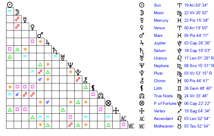 | Moon | 22 Virgo 21 | 13 Virgo 48 | 20 Aquarius 58 |
