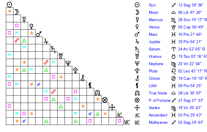 | Sun | 12 Sagittarius 40 | 13 Sagittarius 49 | 9 Pisces 58 |