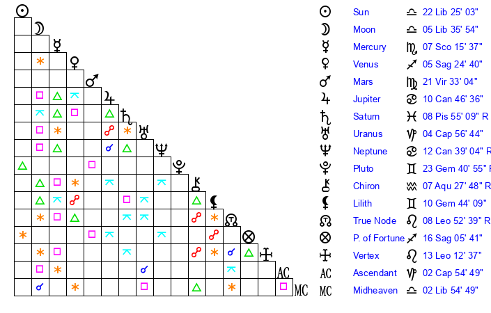 | Sun | 22 Libra 25 | 23 Libra 35 | 22 Aquarius 51 |