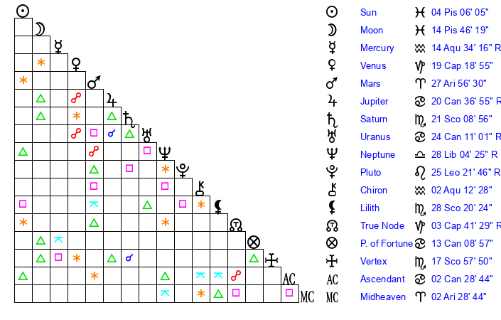 | Moon | 14 Pisces 46 | 6 Capricorn 44 | 16 Libra 10 |