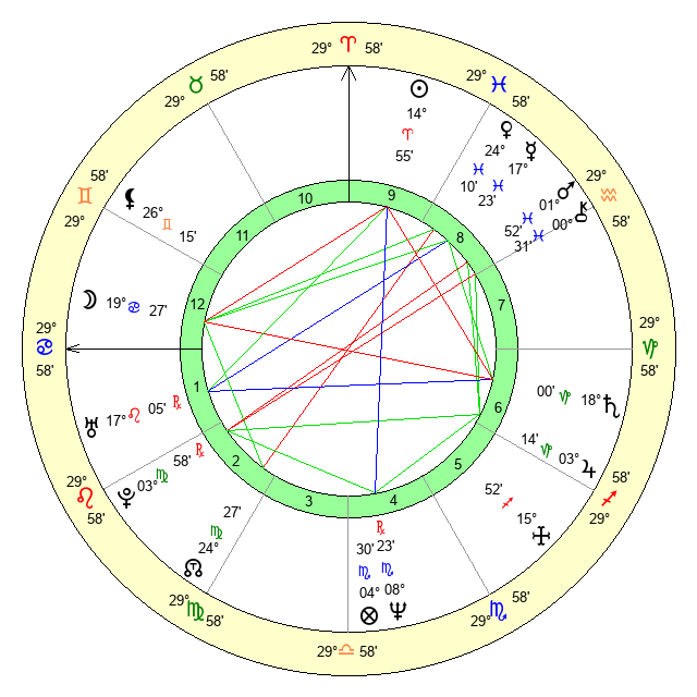 | Venus | 24 Pisces 10 | 26 Pisces 2 | 14 Gemini 4 |