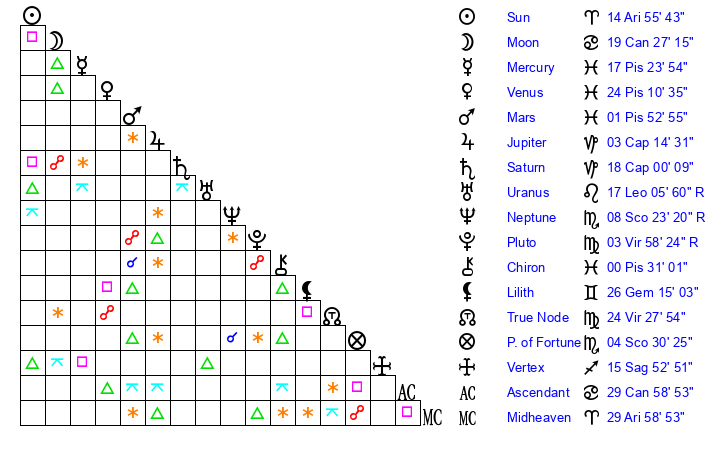 | Venus | 24 Pisces 10 | 26 Pisces 2 | 14 Gemini 4 |