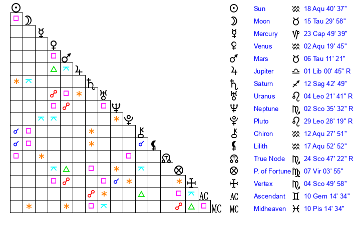| Sun | 18 Aquarius 40 | 19 Aquarius 10 | 26 Aries 26 |