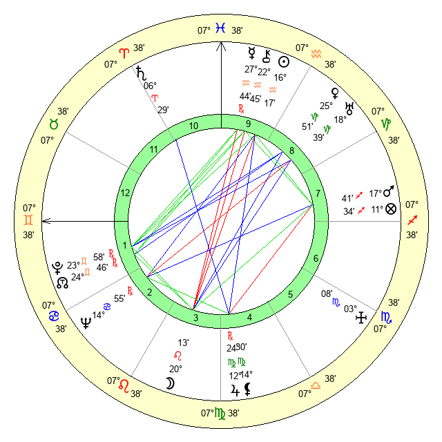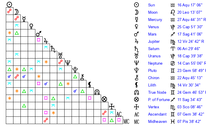 | Sun | 16 Aquarius 17 | 17 Aquarius 9 | 10 Gemini 32 |