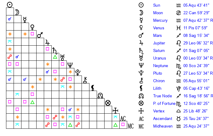 | Sun | 5 Aquarius 43 | 7 Aquarius 0 | 14 Aries 53 |