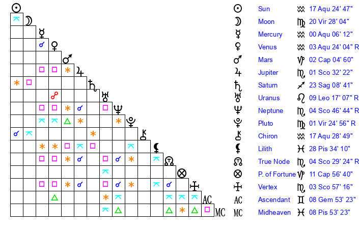| Sun | 17 Aquarius 25 | 18 Aquarius 9 | 24 Aries 14 |