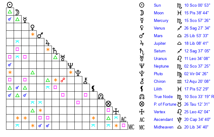 | Neptune | 2 Scorpio 37 | 29 Pisces 44 | 4 Scorpio 34 |
