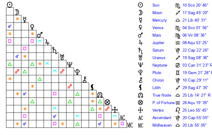| Moon | 17 Sagittarius 48 | 15 Aries 29 | 13 Gemini 52 |