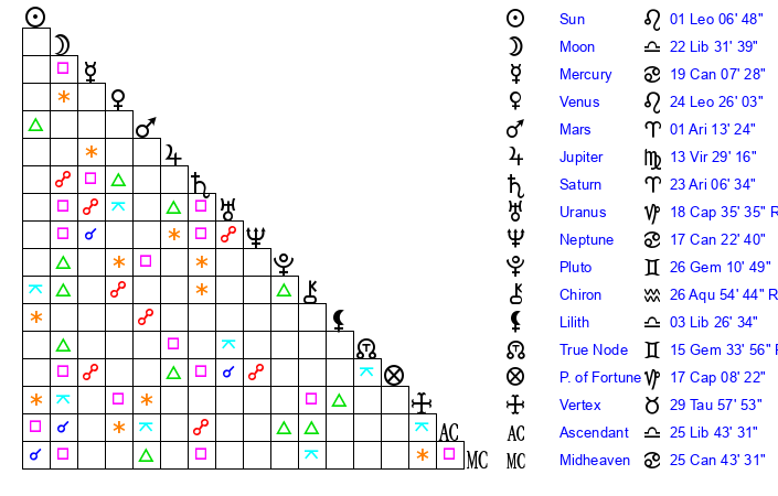 | Moon | 22 Libra 33 | 0 Leo 46 | 17 Capricorn 29 |