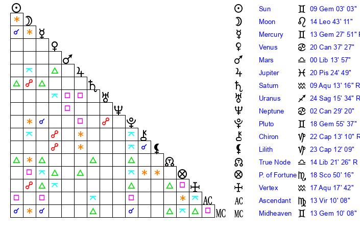 | Pluto | 18 Gemini 56 | 3 Aquarius 38 | 20 Gemini 42 |