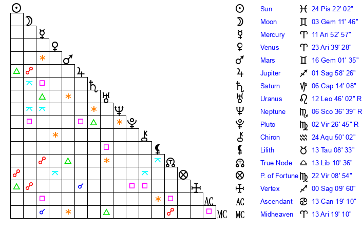 | Pluto | 2 Virgo 25 | 3 Aquarius 14 | 1 Virgo 40 |
