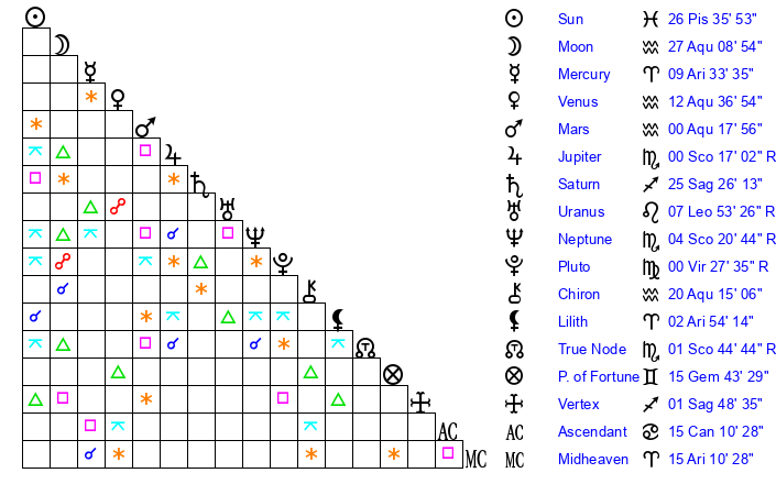| Moon | 27 Aquarius 2 | 4 Scorpio 33 | 0 Leo 28 |
