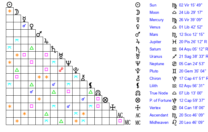 | Mercury | 26 Virgo 39 | 17 Leo 42 | 22 Capricorn 6 |