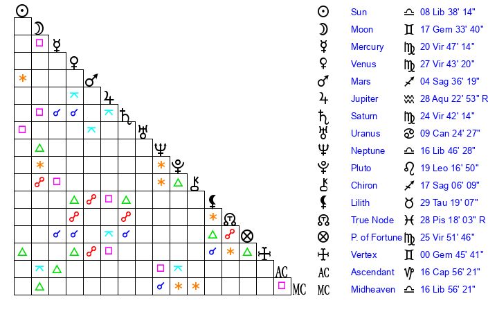 Saturn | 25 Virgo 10 | 27 Pisces 32 | 2 Libra 13 |