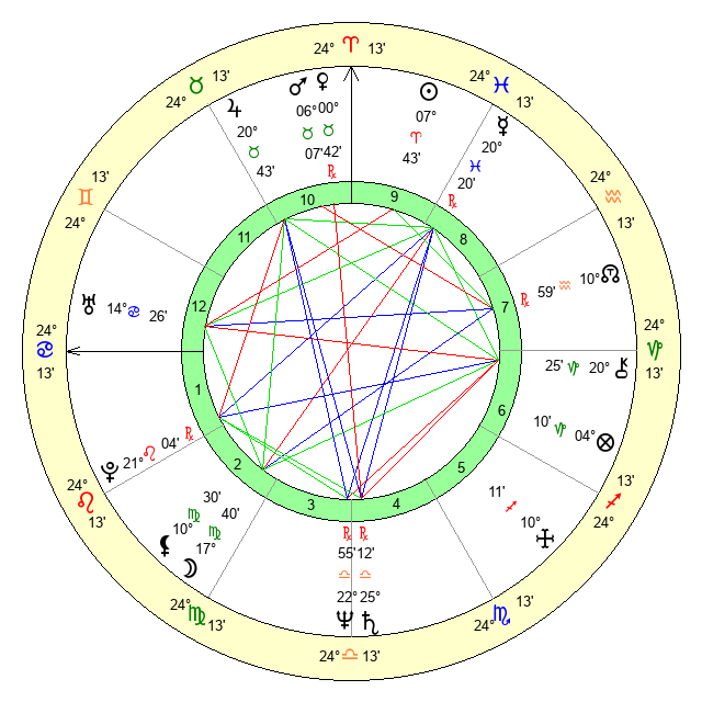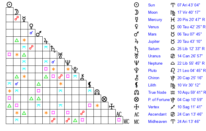 | Moon | 17 Virgo 38 | 27 Pisces 47 | 10 Taurus 7 |