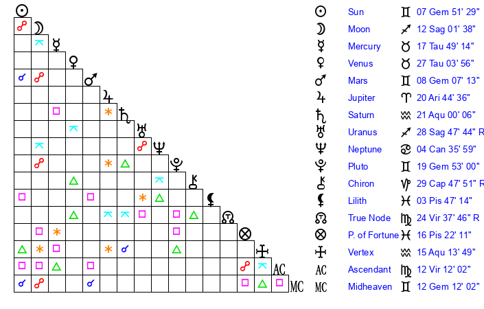 | Pluto | 19 Gemini 54 | 3 Aquarius 40 | 21 Gemini 43 |