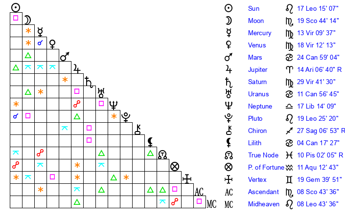 | Moon | 19 Scorpio 41 | 5 Pisces 50 | 7 Leo 15 |