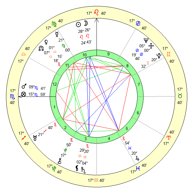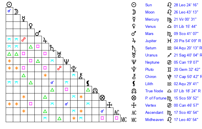| Sun | 28 Leo 24 | 29 Leo 51 | 29 Sagittarius 41 |