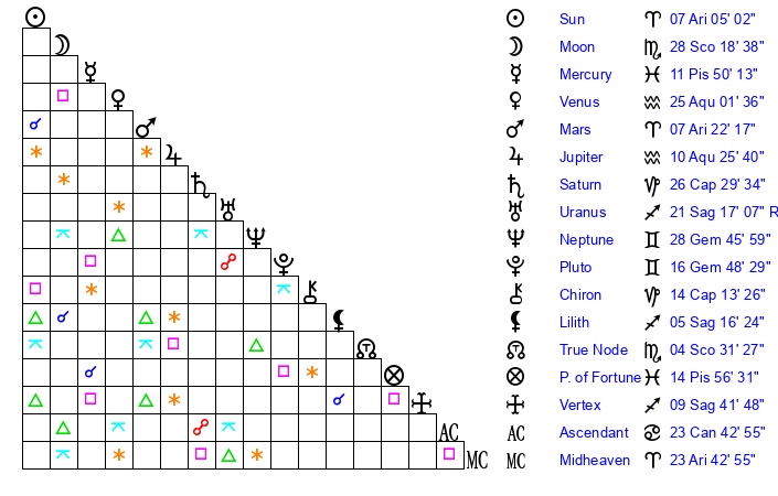 | Moon | 28 Scorpio 11 | 27 Pisces 47 | 25 Taurus 0 |