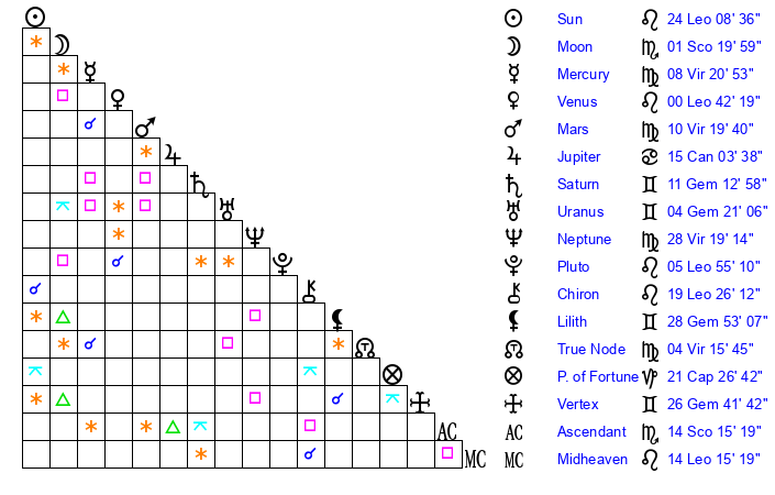 | Sun | 24 Leo 8 | 25 Leo 2 | 15 Scorpio 40 |