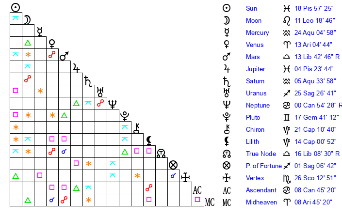 | Sun | 18 Pisces 57 | 20 Pisces 22 | 17 Cancer 14 |