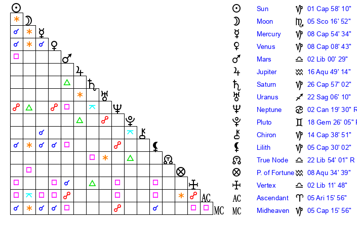 | Moon | 5 Scorpio 14 | 25 Aquarius 42 | 24 Aries 23 |