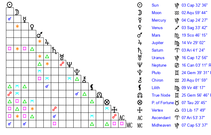 | Venus | 3 Sagittarius 34 | 20 Aquarius 52 | 27 Aries 52 |
