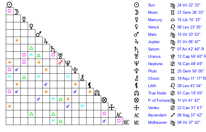 | Sun | 24 Virgo 23 | 25 Virgo 3 | 21 Capricorn 53 |
