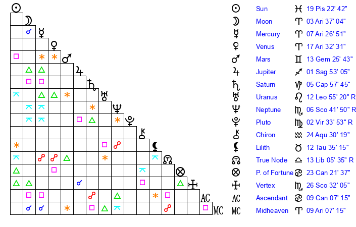| Pluto | 2 Virgo 32 | 3 Aquarius 7 | 1 Virgo 39 |