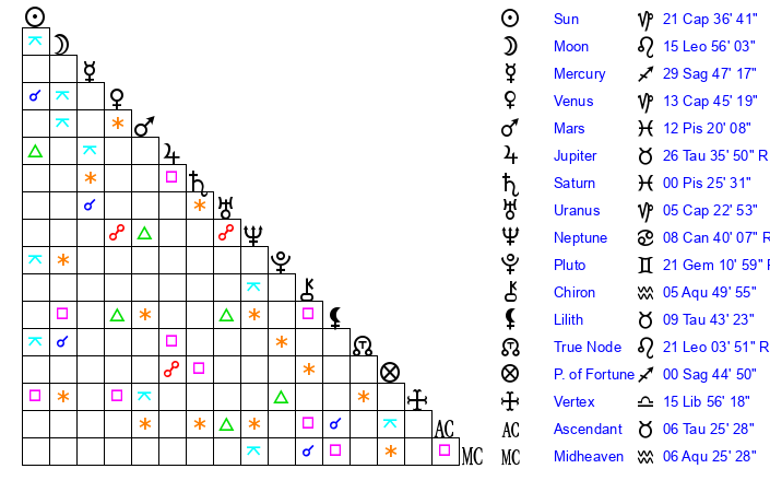 | Venus | 13 Capricorn 46 | 9 Pisces 53 | 11 Gemini 43 |