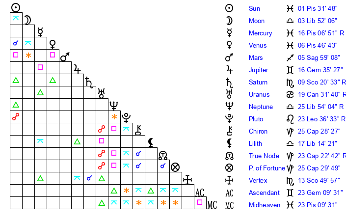 | Neptune | 25 Libra 54 | 28 Pisces 35 | 24 Libra 13 |