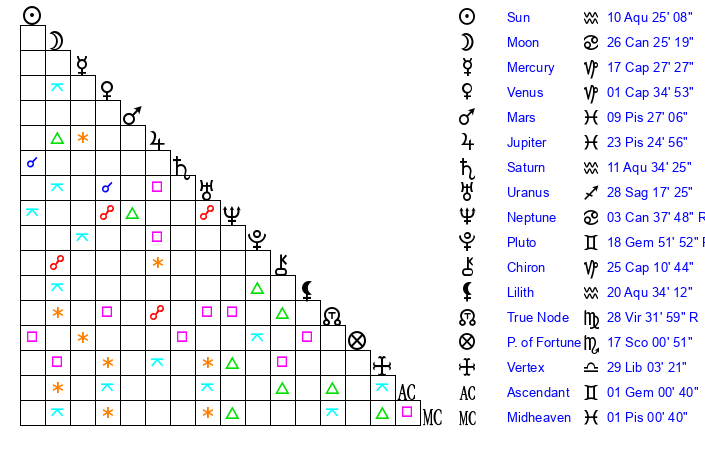 | Sun | 10 Aquarius 25 | 12 Aquarius 4 | 9 Gemini 46 |