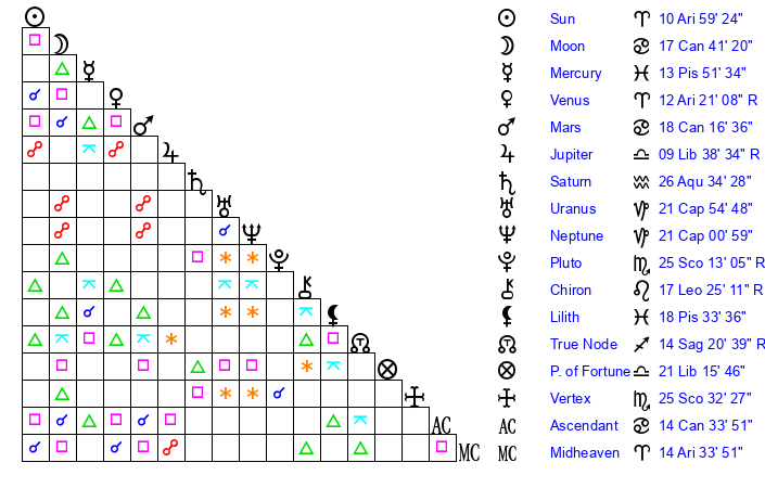 Moon | 17 Cancer 44 | 12 Taurus 59 | 25 Virgo 0 |