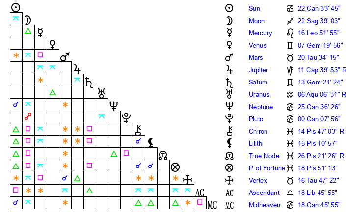 | Neptune | 25 Cancer 37 | 2 Aries 8 | 28 Cancer 14 |