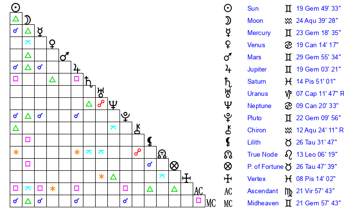 | Pluto | 22 Gemini 11 | 3 Aquarius 29 | 23 Gemini 44 |
